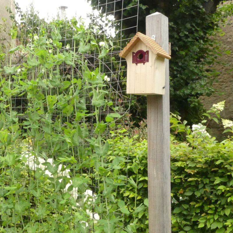 Entrée protégée et décorée ! Ce nichoir accueille les mésanges bleues, nonnettes, huppées ou noires... Il est conçu pour accueillir une famille de 5 à 10 oiseaux en toute sécurité. Le bois est épais 1.5 cm.