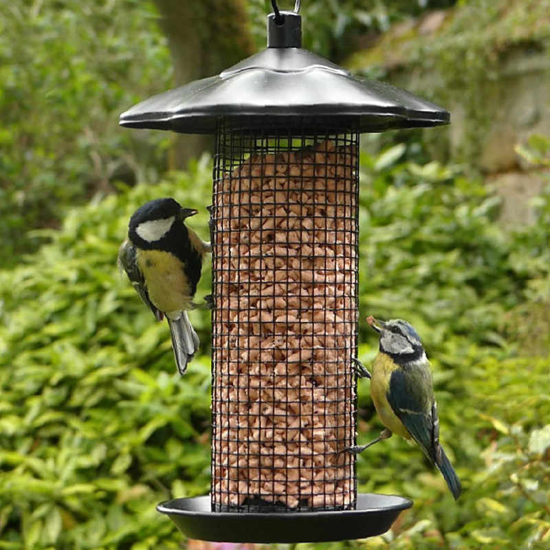 Le distributeur de cacahuètes et/ou nuggets. Les oiseaux acrobates, comme les mésanges (bleues, à longue queue, charbonnières, ou huppées, mais aussi la sittelle torchepot et le pic épeiche) s'accrochent sur le grillage et dégustent les cacahuètes décortiquées.