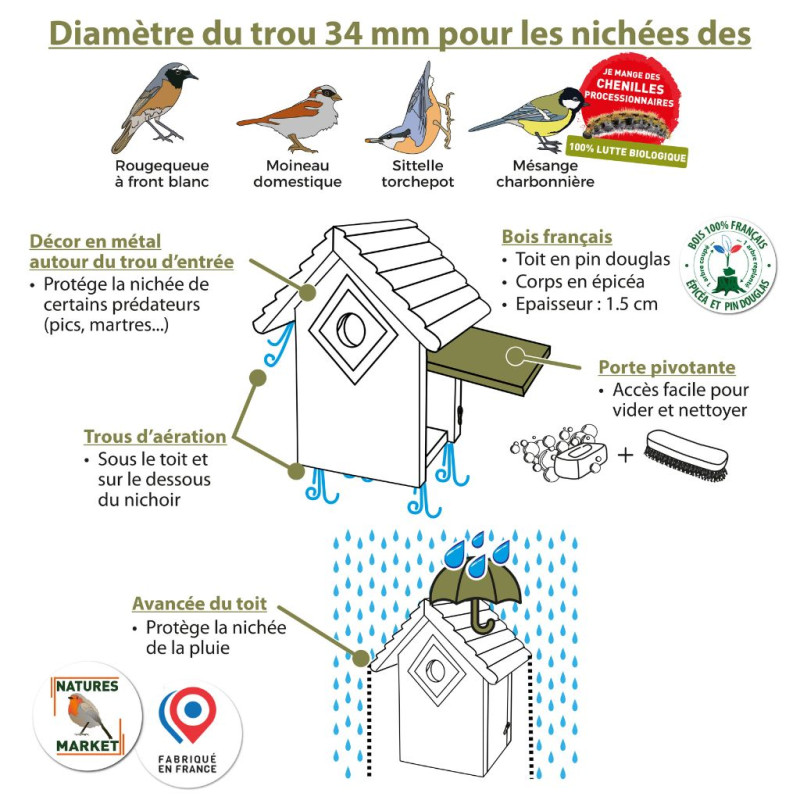 La solidité du bois 1.5 cm d'épaisseur, combinée à un toit en surplomb, assure une protection optimale contre les intempéries. Des perforations dans le fond assurent une bonne aération, tandis que l'ouverture latérale facilite le nettoyage complet à l'automne (au printemps, les oiseaux nichent et il est crucial de ne pas les déranger).