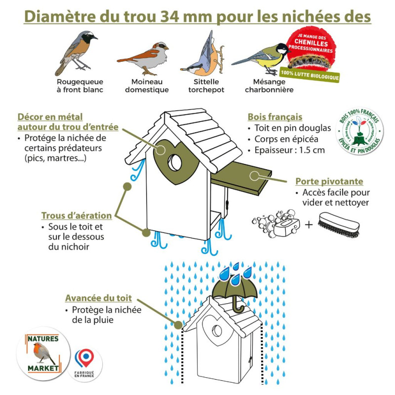 La solidité du bois 1.5 cm d'épaisseur, combinée à un toit en surplomb, assure une protection optimale contre les intempéries. Des perforations dans le fond assurent une bonne aération, tandis que l'ouverture latérale facilite le nettoyage complet à l'automne (au printemps, les oiseaux nichent et il est crucial de ne pas les déranger).