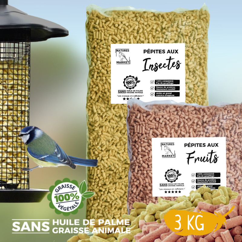 PÉPITES MAXI SAC 3KG Faciles à manger...Ces pépites (nuggets) de graisse VÉGÉTALE aux fruits ou aux insectes sont totalement adaptées aux oiseaux du jardin. Une nourriture gourmande et nutritionnelle pour les oiseaux.