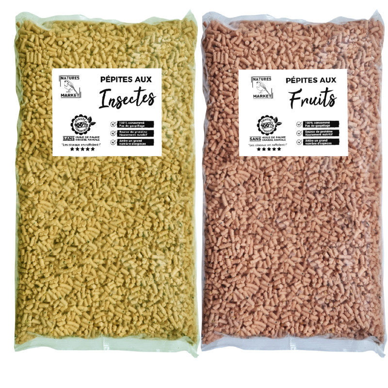 Les pépites sont économiques car 100 % consommées par les oiseaux : sans gaspillage ni résidu. Elles ne fondent pas à la chaleur et résistent au froid et à la pluie.
