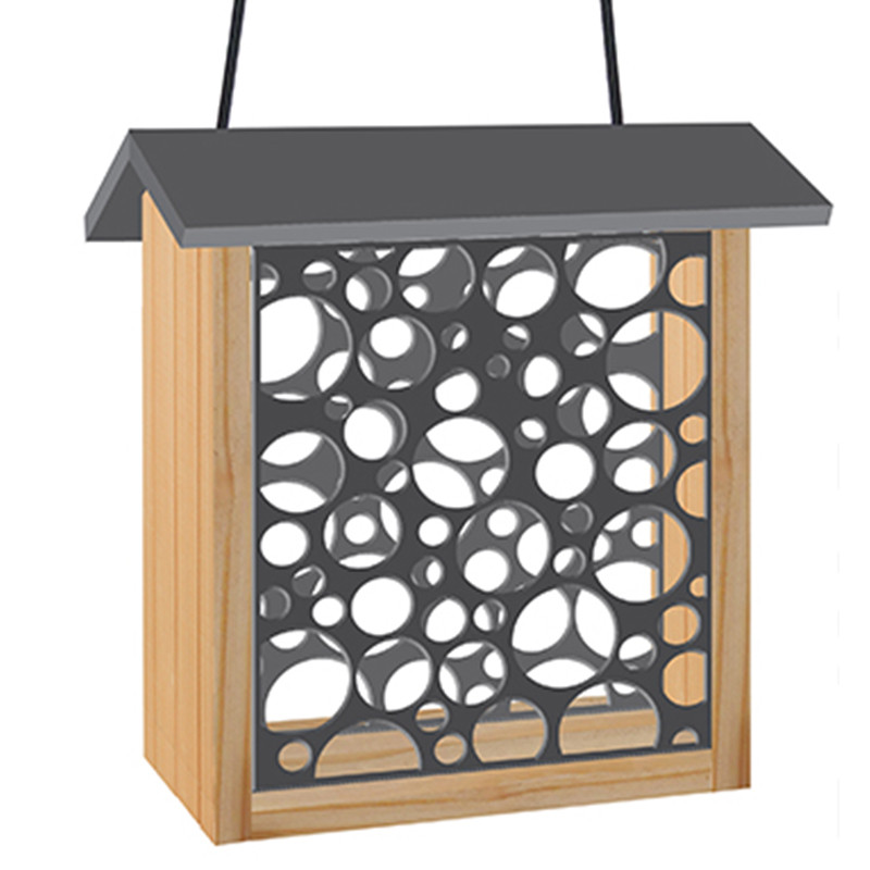 Son toit et les 2 grilles sont en briques alimentaires recyclées. Le toit coulisse sur le câble en acier gainé, et les grilles sont amovibles. Il permet un remplissage et un nettoyage facile.