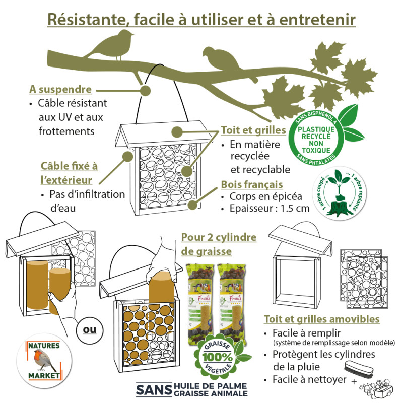 Mangeoire à remplir avec 2 cylindres de graisse végétale (pas de boeuf et pas d'huile de palme, c'est essentiel !).
